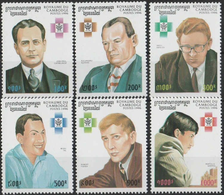 Kambodja – 6 kompl. ** – Schackmästare 44,00 kr 6 val kompl. ** – Mi. 1631-1636; Sc. 1551-1556 – Porträtt av schackmästare, bla Fisher och Karpov I lager Kambodja - 6 kompl. ** - Schackmästare mängd Lägg till i varukorg Relaterade produkter Snabbvisning Snabbvisning Kampuchea 1985- 7 kompl. ** – Schack 32,00 kr Lägg till i varukorg Snabbvisning Snabbvisning Kambodja 1999 – 6 kompl. ** – Ormar 36,00 kr Lägg till i varukorg